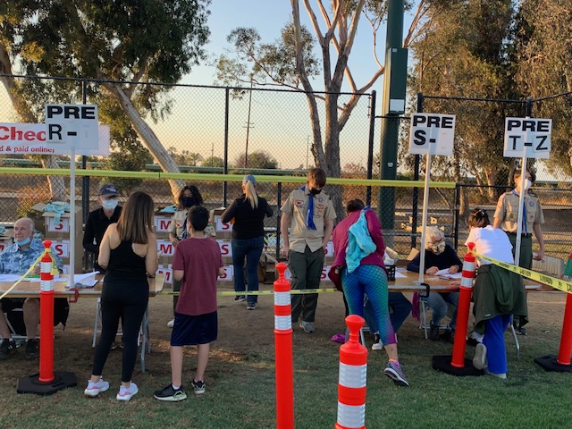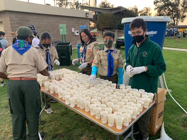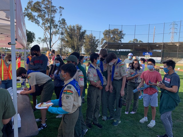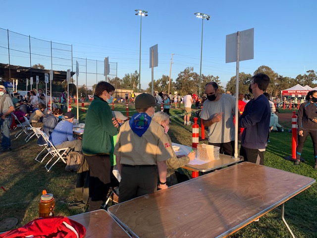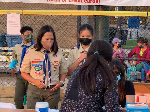 Last night, we had 18 scouts and 6 adult volunteers for the Moonlight Run event at Baylands (Palo Alto). We all met at 5:30pm at the baseball field located next to Baylands Athletic Center where we registered and had free pizza provided by the event organizers. The scouts wore their Class A uniforms to show the community who we were and also to keep track of all of the scouts. Then each of the scouts lined up behind an adult registration volunteer and we were responsible for pulling t-shirts (extra small, small, medium, large, extra large) and giving it to the runners. Some of us also had to take registration forms to the race office, fill and pass out water for runners who completed the race, and put away empty t-shirt boxes. Everyone did a great job!